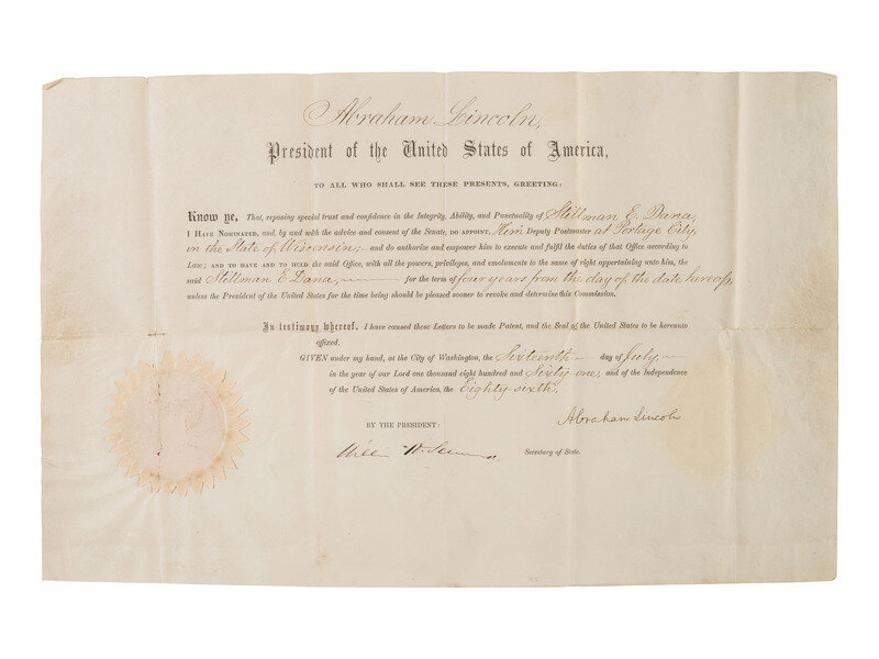 Signed ("Abraham Lincoln") as President, and co-signed ("William H. Seward") as Secretary of State. Appointing Stillman E. Dana as Postmaster of Portage City, Wisconsin for a term of 4 years.