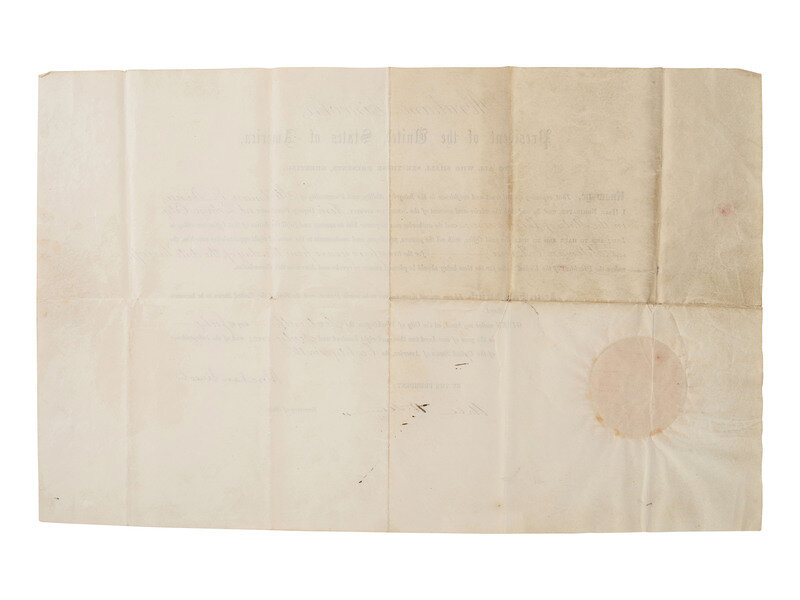 17 1/2 x 11 1/4 in., creasing from folded storage, with some separations at crease intersections, some age toning and soiling, with light wear and wrinkling to edges and corners. Embossed seal to lower left portion of document.