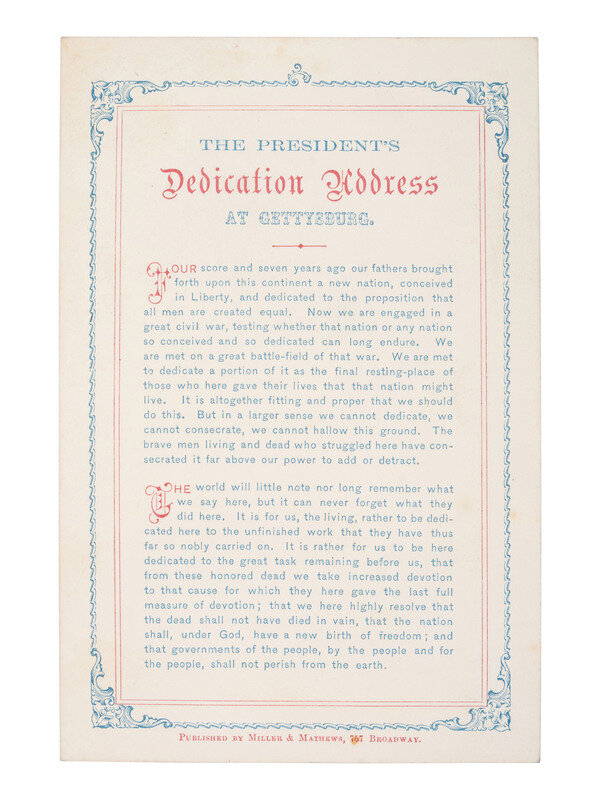 [LINCOLN, Abraham (1809-1865)]. The President's Dedication Address at Gettysburg. New York: Miller & Mathews, [1864]. FIRST SEPARATE PRINTING.
