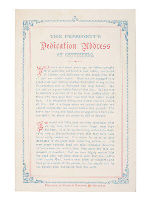 According to a note sent to Lincoln from the publishers, Miller & Mathews, dated 23 March 1864, these small broadsides were created for distribution at the New York Metropolitan Sanitary Fair held in April 1864.