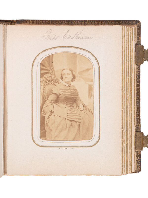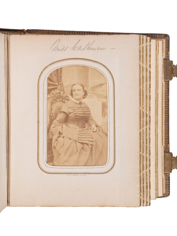 [LINCOLNIANA]. Album containing 50 CDVs of personalities from the US and abroad, featuring the Abraham Lincoln "Cooper Union" pose by Mathew Brady.