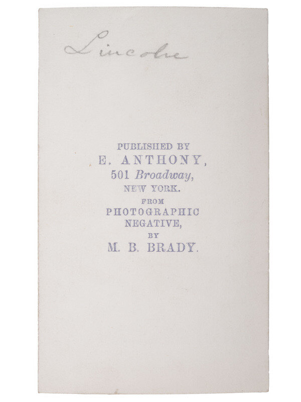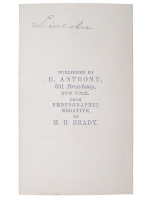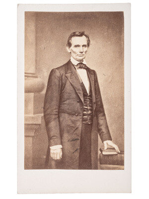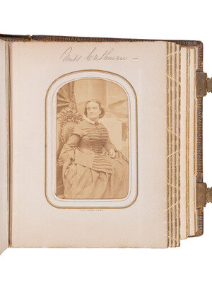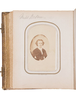The centerpiece of the album is a CDV featuring the "Cooper Union" portrait of Abraham Lincoln, taken by Mathew Brady in New York on 27 February 1860, just one day prior to Lincoln delivering his famous address at the Cooper Institute (O-17). Verso with E. & H.T. Anthony/Brady imprint.
