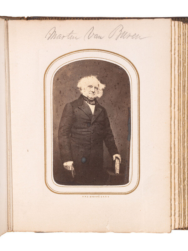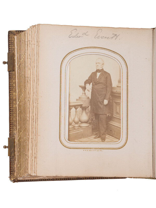 Approx. 6 x 4 3/4 in. album manufactured by Goupil & Co., New York, containing 50 CDVs, including a combination of "from life" photographs and images after lithographs/engravings of politicians, generals, European royalty, and other personalities of the era. The name of the subject, when available, is written on the album page, above each photograph (not on the photograph itself). Multiple photographers/publishers are represented in the album, most notably Mathew Brady (New York), Whipple (Boston), Silsbee, Case & Co. (Boston), Black & Batchelder (Boston), and Disderi (France).