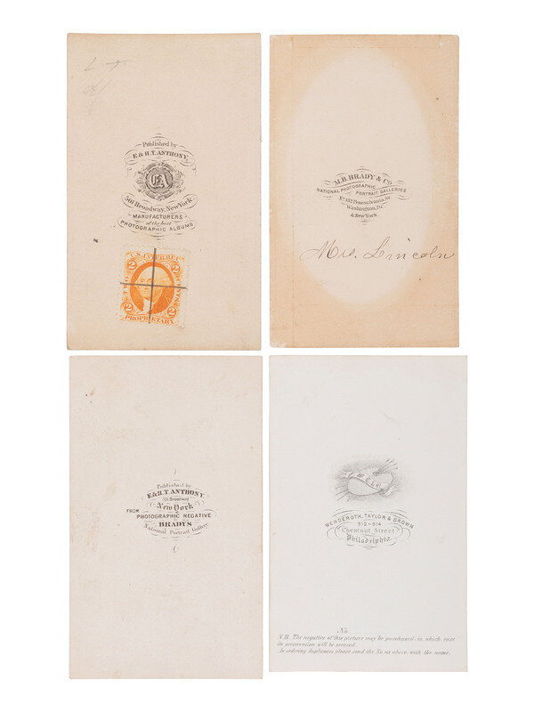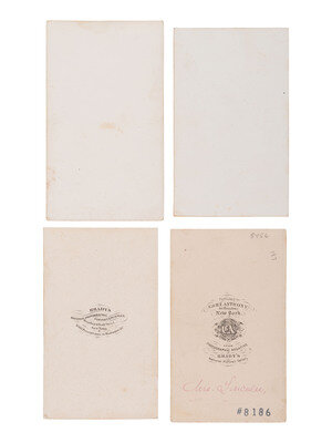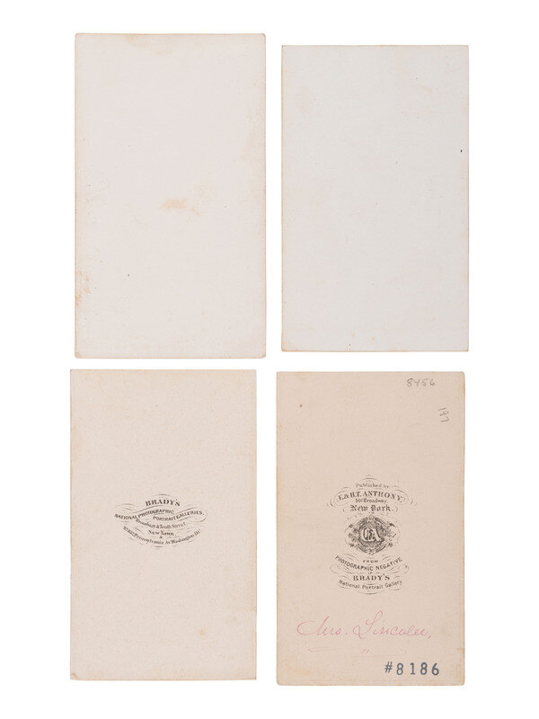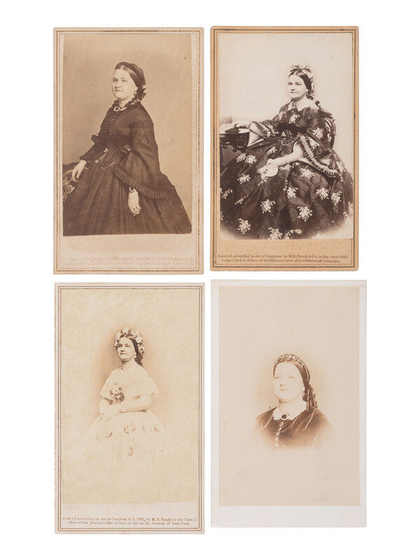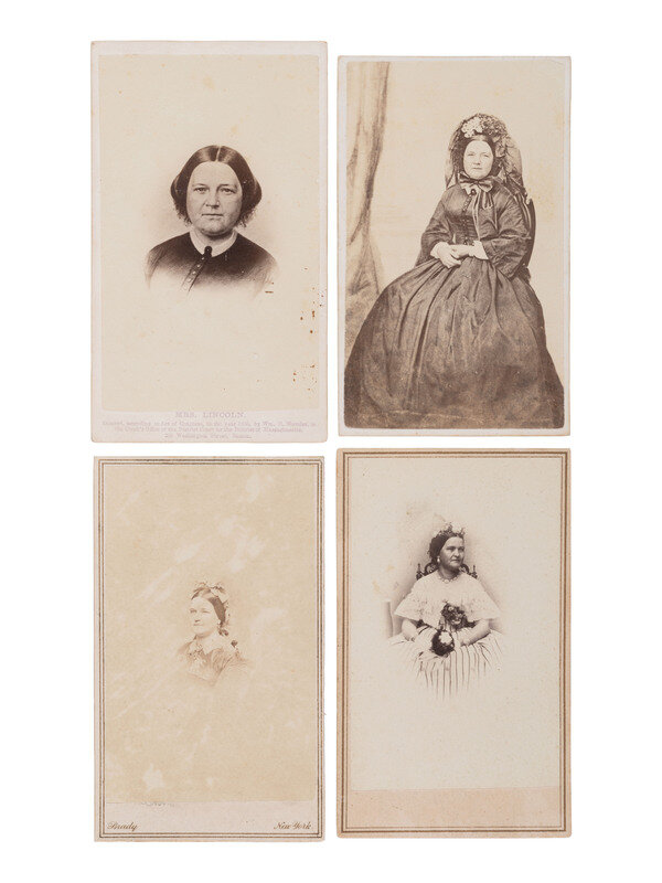 8 CDVs of Mary Todd Lincoln, wife to Abraham Lincoln and First Lady of the United States from 1861-1865. The group is comprised of portraits of Mrs. Lincoln taken during various sittings before and after Lincoln's assassination, some with copyright dates of 1862 and 1865. Photographers/publishers include Mathew Brady, New York and Washington, DC (2), E. & H.T. Anthony, from Brady's photographic negatives, New York (3), William H. Mumler, Boston, MA (1), Wenderoth, Taylor & Brown, Philadelphia, PA (1, possibly a previously known pose). Also included is an uncredited image of Mary Todd Lincoln in mourning gown. This image of Mrs. Lincoln is typically attributed to 1862 when she was mourning the death of her son, Willie.