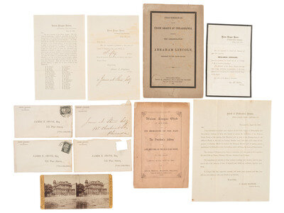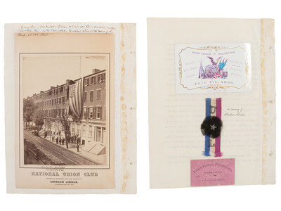 5 1/4 x 6 7/8 in. albumen photograph mounted on larger cardstock and thence laid down on typewriter paper (print with good contrast, very few imperfections; mount with some wear and toning; typewriter page with fabric reinforcement to binding edge and creases and small tears to edges). Mount bears printed caption beneath image: "National union Club / Draped in Mourning for the Death of / Abraham Lincoln. / Assassinated April 14th, 1865." A note of identification is inked just below image: "Grandfather J.E.C.O.S.A. President of the Club." And along the upper edge, partly on the typewriter paper and partly on the cardstock mount is another inked note, clarifying the location of the featured building: "'Girard Row' - Chestnut St. between 11th and 12th Sts.; sometimes called 'Cadwallader Row', as the Cadwallader homestead stood at the corner of this block, at 12th Street." -- 3 3/4 in. lg. tricolor ribbon with centrally attached black crepe cockade with metal letters "U" and "L" and metal 5-point star at center. Laid down on typewriter paper with ink inscription reading, "In memory of Abraham Lincoln." -- 5 x 3 1/4 in. glossy card promoting a July 4th celebration featuring "100 Guns Served by the Keystone Battery." Philadelphia: King & Baird, Printers, [1866]. Laid down on typewriter paper above aforementioned ribbon. -- 2 7/8 x 1 3/4 in. printed Union League "Member's Ticket." Laid down on typewriter paper below aforementioned ribbon and card. -- An additional, unmounted "Member's Ticket" to an event taking place on 22 February 1864. -- Glossy "Ladies' Invitation" to the League House on 22 February 1864. -- Stereoview featuring the "Union League Club House, Philadelphia" by James Cremer, Philadelphia, PA. -- Together, 7 items.