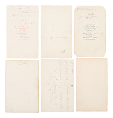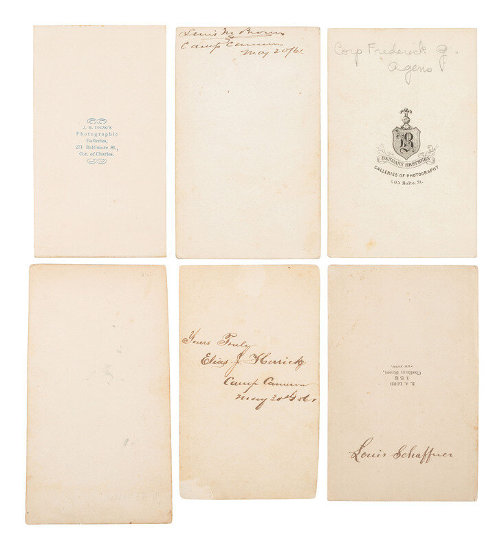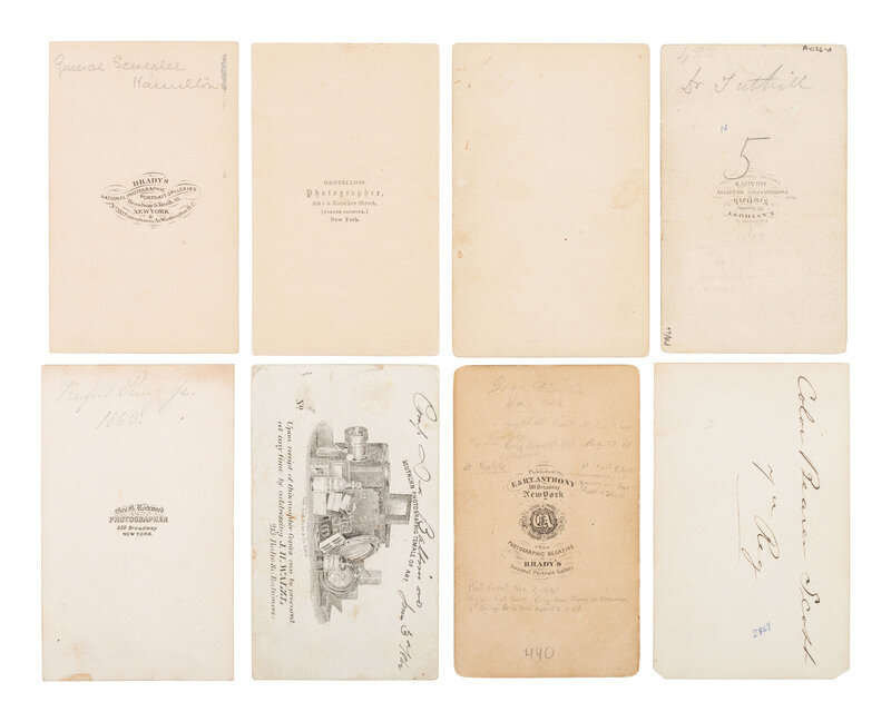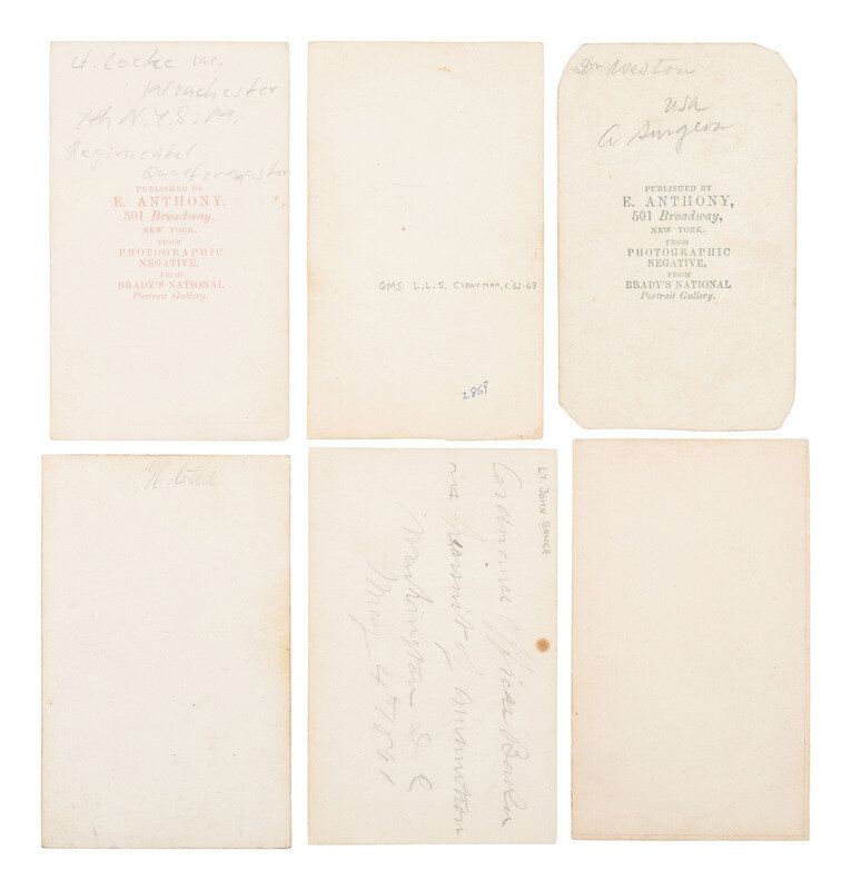 Brevet Major Rufus King, Jr. New York: Geo. Rockwood. In addition to serving with the 7th NY State Militia, King served with the 4th US Light Artillery and US Horse Artillery Brigade. He received the Medal of Honor for his actions at White Oak Swamp 30 June 1862. -- John S. Loud. Baltimore: J.H. Walzl. Inscribed on verso, "Camp Dix, Baltimore, June 3, 1862." In addition to serving with the 7th NY State Militia, Loud served with the 12th New York Cavalry as well as the 9th US Cavalry "Buffalo Soldier" Regiment. -- General Schuyler Hamilton, grandson of Alexander Hamilton. New York: Brady. -- General Egbert Viele. New York: Brady, Anthony. -- Colonel Marshall Lefferts. New York: Grotecloss. --Captain Henry Shumway. Washington: Brady. -- Simon W. Scott, Color Bearer, period identification on verso. -- Dr. Samuel B. Tuthill, Assistant Surgeon. New York: Brady, Anthony. -- First Lieutenant Richard Halstedt. Washington: Brady. -- Lieutenant Locke W. Winchester, Quartermaster. New York: Brady, Anthony. -- Possibly L.L.S. Clearman, Commissary Sergeant (period print possibly affixed to later cardstock mount). -- Lieutenant John A. Baker, Ordnance Officer. Verso with penciled identification dated May 1861. -- Second Lieutenant Joseph B. Young (period print possibly affixed to later cardstock mount). -- Chaplain Sullivan H. Weston. New York: Brady, Anthony. -- William Patten, Commissary, signed in lower margin of mount. -- Louis Schaffner. New York: R.A. Lord. -- Elias J. Herrick, verso with signature from Camp Cameron, May 1861. -- Corporal Frederick G. Agens. Baltimore: Bendann Brothers. -- Lewis M. Brown, verso with signature from Camp Cameron, May 1861. -- Harold Bunting. Baltimore: J.H. Young.