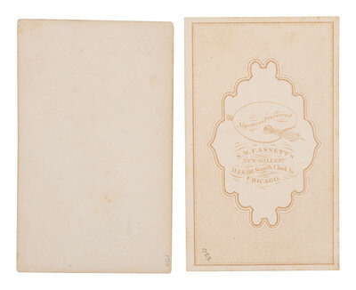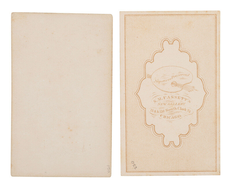 Landscape-oriented CDV featuring a crowd of people gathered just outside of the Globe Tavern in Springfield, where he and Mary Todd rented a room in the 1840s after they were first married. Chicago, IL: S. M. Fassett, [1865]. Copyright to mount recto, photographer's imprint to verso. -- Composite CDV featuring an image of mourners in front of the Lincoln home in Springfield, flanked by a pair of mourning ribbons, with a facsimile of E. O. Townsend's order to convey the body of the late president from Washington, DC to Springfield above. Uncredited, n.d. -- Together, 2 CDVs.