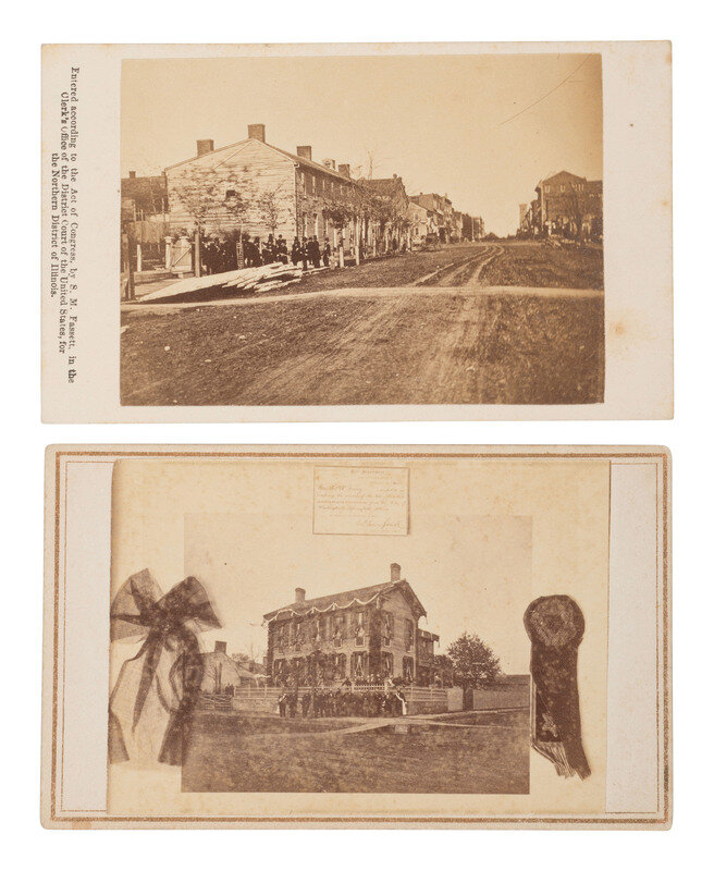 [LINCOLN, Abraham (1809-1865)]. Pair of CDVs featuring mourners outside of the Lincolns' first and last residences in Springfield, IL.