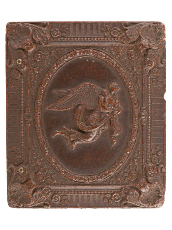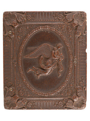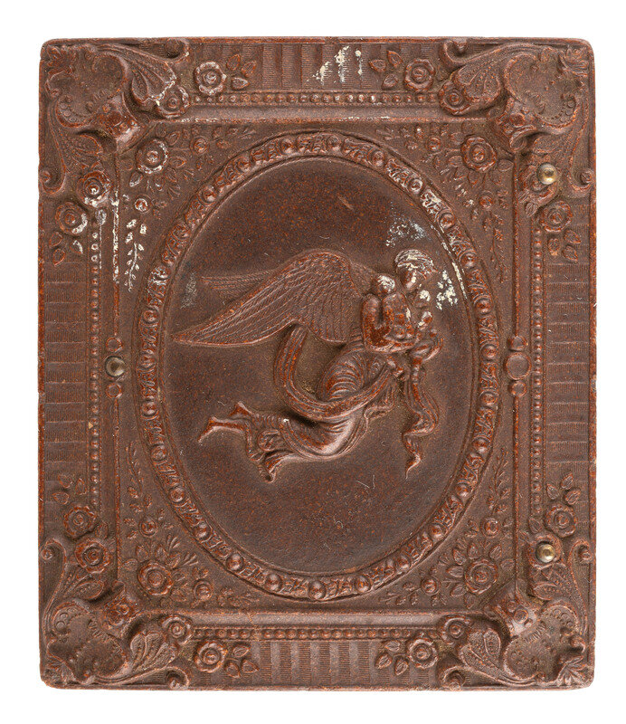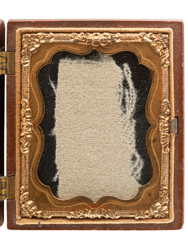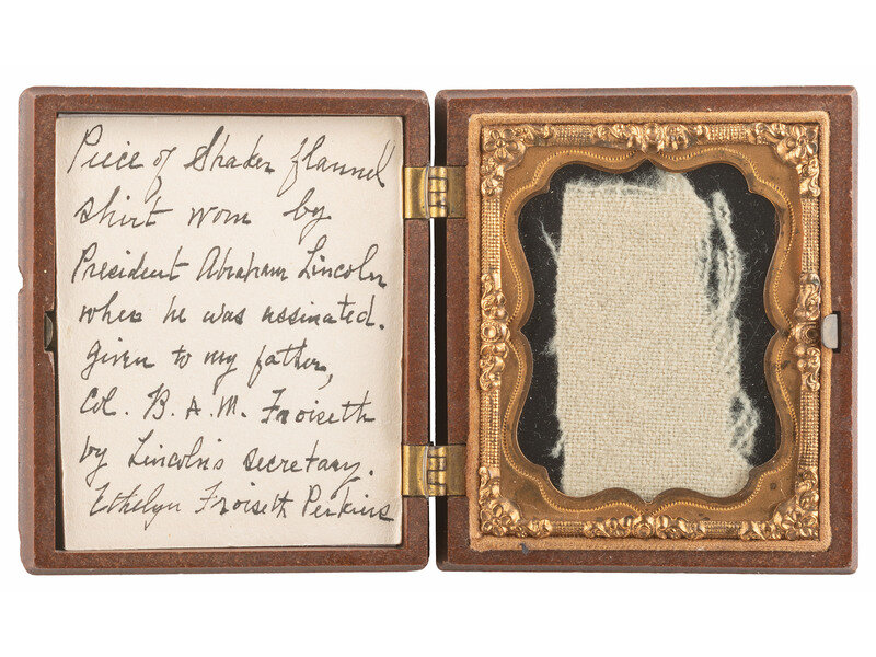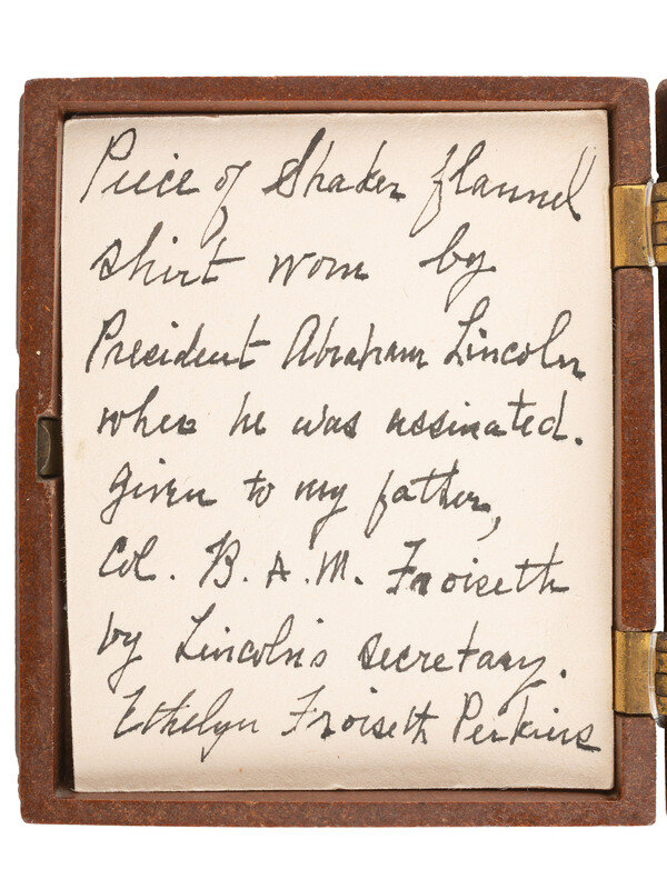 Fabric remnant, approx. 2 x 1 1/4 in. (sight), housed under glass in ninth plate Union case (fabric unexamined outside case, unable to determine definitively if fabric is wool or cotton, case with wear and some surface residue but overall good condition). Autograph note signed adhered to case opposite fragment reads, "Piece of Shaker flannel / shirt worn by / President Abraham Lincoln / when he was assinated [sic]. / Given to my father, / Col. B.A.M. Froiseth / by Lincoln's secretary. / Ethelyn Froiseth Perkins."