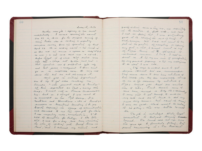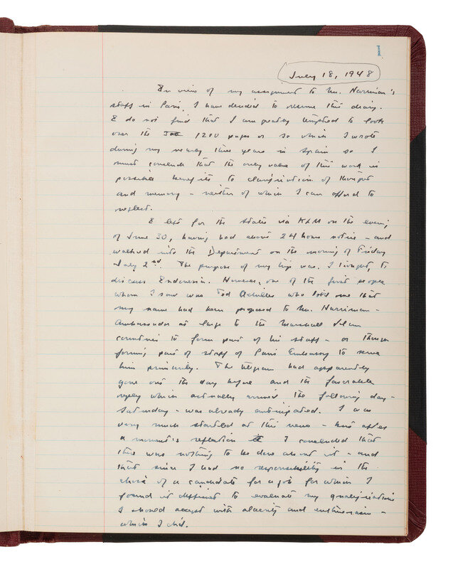 A wonderful 68-page diary (1948-50) by Philip Bonsal as Political Advisor to the US Special Representative in Europe (i.e., Averill Harriman) who headed the Marshal Plan. Great content detailing the negotiations surrounding the implementation of the plan. In part: “July, 18, 1948 In view of my assignment to Mr. Harriman’s staff in Paris, I have decided to resume this diary …We have [oversight] of 16 countries [Bonsal details meetings, people, needs of Scandinavian countries] “… don’t feel a change in Sweden’s position would immediately result in soviet aggression… don’t feel our East West trade policies primary factor in Finland…relinquishing some of their defense commitments- extreme dependence on us of UK & all West Europe. I hope we are not stressing military angle too much… [Discusses a meeting to discuss setting up an E(ast) W(est) trade group and talks at the Hague.] S_ is trying to get cabinet approval for a proposal to liberalize trade and currencies though W. Europe including W. Germany, but not U.K… $200M made up of contributions from country’s gold reserves and from us. My fellow delegates in E.W. trade, and Harriman & Forrestal sent me a memo… to general effect that proposal I made with Ed Martin’s approval at yesterday’s meeting was more or less selling our position down river. So we had a meeting in Averill’s office… [Discusses lunch with Milt Katz, a WWII OSS operative & Deputy Chairman of the Marshall Plan)]. “… he sees at end of war we & Britain & French & Soviets agreed that we would sit on Germany. Then Soviets moved away- we are only potential obstacle to them as Britain and French are very weak… Our ineffable Senator [Elmer] Thomas has caused something of a stir by advocating the rearmament of some German divisions. .. Soviets have already erected a military force in their area of Germany. Le Monde editorial … envisaging eventual armament of Germans… functioning at the direction of a Western European high command… [W]e should [further] European integration in the military field in the face of the Soviet menace. .. [Sir Edwin] Plowden explained to Milt the general British feeling that in the war- Britain had been left on her own when the continent folded up in 1940, that help had come only from the Western Hemisphere. We will gladly go as far as you will in association with W. Europe but no farther. In Milt’s judgment… only we can provide leadership in Western world. I don’t go along with such a sweeping generalization… Hector Prud’homme dropped in… says we are asking Germans to assume large and undefined obligations of military governance... He feels things in Germany are at a delicate balance. My view is that we have gone further for Germany… than they have any right to expect…” “lengthy presentation to Averill and Milt by Roscoe Drummond and his information boys…. Strongly endorsing a proposal… of transportation facilities in Africa south of Sahara & making suggestions on how it can be done... & how Union of South Africa might be brought in….[D]inner at embassy for Sec. of Defense Louis Johnson, a heavy, tired looking man… told me he’d heard a lot about me… General Bradley also there, a very real person [mentions more names]… sat next to Jim Bruce- none of David’s charm, heavy set & rather gross- spoke incessantly about what he told Truman about such matters as representation allowances for F.S.O… I expect he and [Juan] Peron hit it off personally very well…Col. [Bill] Donovan with David Bruce landing on the coast of Normandy in the early invasion days. Col. had been specifically invited not to be here. They ran into Gen. Bradley who says “what are you doing here’ with some emphasis to which Col replies: “I just wanted to present David Bruce to you! … John Newman in town. He thinks integration will come only if we force it… Genl. [Walt] Rostow [OSS WWII] dropped in. He is taking Walter’s place at Geneva with [Gunnar] Myrdal [Nobel Prize Economics]. I used to know him when he was helping Dean in the Dept.- very clever and more sensible than Walter… He says US currency policy is becoming increasingly unpopular in Europe. He [referred] to story that… French-Soviet trade negotiations were improved because France, under US pressure, refused to deliver three tankers to the Soviets. I said… unlikely Soviets should have broken off because of three lowly tankers… I reiterated our policy support for U.N… [Robert] Marjolin [i.e., Sec. Genl. of OEEC] sent a paper to [Paul] van Zeeland [Belgian statesman] making two minor suggestions and three points not acceptable. [Bonsal then details Marjolin’s unacceptable proposals and those Van Zeeland accepted] “. .. An important factor in the whole situation is [Belgian Prime Minister Paul-Henri] Spaak’s own position… [Roger] Ockrent doesn’t know where it stands. Belgian internal situation due to the upcoming consultation on the royal question is very tense. Spaak does not want to eliminate himself from internal politics… plenty of people who would like to see him out… Britain’s attendance is highly important. [Ernest] Bevin [British Foreign Secretary] rather double crossed both Acheson and Hoffman on this [Bonsal then details Bevin’s duplicity] … Harriman told me later in the day that Paul Hoffman takes [an] extremely serious view of British attitudes- which continues to be one of non-support and non-opposition. He has gone so far as to intimate this might be a touchstone of British cooperation and … could result in a loss of aid to Britain. We are to pitch this very strong[ly]… Douglass reminded [Clement] Attlee of [Sean] Macbride’s offer to resign his post as Vice-Chairman… Attlee favors our sending our message—Why?” [Bonsal then details negotiations with top reps, in trying to reach agreement between everyone] “…Acheson plans to send his message to all PCs, that he and Hoffman attach very 
