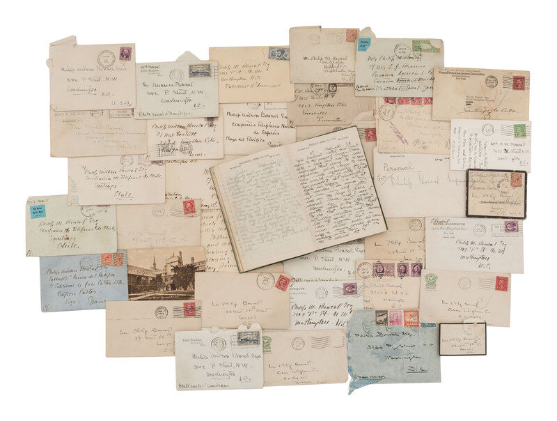Appx. 30+ letters from Stephen Bonsal (signed “Dad”) including: July 8, 1935 ALS, Paris, ”… we shall keep out of the Abyssinian fracas [i.e., Ethiopia and Italy Walwal incident] but have an eagle eye on the European situation. Of the former- Century published my yarn “Lawrence of Arabia” about July 22nd—put a copy aside for me….” ; Feb 1, 1935 TL and ALS “… re your report on the Chilean foreign Debt … shall I have copies made for Roper Sec. of Commerce and for Walton Moore Asst. Sec. of State who frequently refers in great praise to your memo. Some aspects of the Roosevelt policies “I am also sure that Francis White… would welcome it and would make use of it….”; TLS, April 4, 1935, re organizing the Fed. Communications Commission (FCC) ”… [Anning S.] Prall will run the whole shooting match and he and Senator Wagner of N.Y. besides your record and your writing are your best backing and support… do not think that Sykes was helpful … he was about to be demoted… Prall told me the investigation would surely last 18 months and might last forever….” ALS, March 26, (1935): “… What you say about the bitterness of the corporations against the New Dealers is perfectly true, but they will get over it. I recall when Frank Kellogg was made Chief Trust Buster by Theodore Roosevelt they always spat when his name was mentioned. Two years later they were glad to secure his legal services & were glad to pay him large fees….” Oct. 11, 1933 ALS “… the day after I saw him I hear indirectly Colonel House was not very well and they took him to his daughter’s out on Long Island for a rest, thus missing the lunch with the President upon which he counted much as did I fear many of his henchmen….” ALS, Paris 1935: “I have put in several mornings at the Herald library reading some of my 1890 dispatches from the Balkans- I wish we filed in New York at once… as I found many interesting and long forgotten dispatches….” Additional letters in1936 discuss the tragic death of Stephen Bonsal White (Phil’s cousin) and complement Philip’s work “… More of [?] talks with Commissioner Walker… there is no doubt that he was greatly impressed by your presentation of some aspects of the Roosevelt policies as were [Colonel] House and [Daniel] Roper….“ Long ALS, June 2, 1935 from Brit. Embassy staffer signed “Bill” to Phil Bonsal sharing gossip between their two embassies “…Hoffman Philip is not definitely appointed Ambassador and the Embassy is to remain in the charge of your old friend Ted Scott [in fact, Philip, a rough rider and friend of Teddy Roosevelt, became US Ambassador at Chile later that year]…; 2 pg. friendly ALS, circa 1943, The Under Secretary of State lthd, by Sinclair Weeks w/ later 1991 pencil notation by Phil “I think this letter was written to me in August of 1943, give or take a month. A few weeks later S W was dropped by FDR- to the glee of Cordell Hull….”