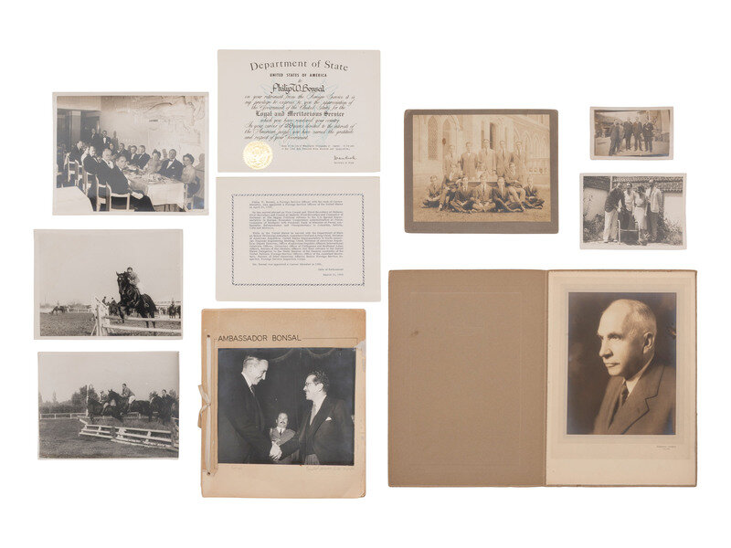 [With:] Original photos, some signed and inscribed, including: 19.5” x 25.5” official photographic portrait print of President Roque Saenz Pena (1851-1914) of Argentina signed & inscribed (as President): “al Senor Bonsal, Roque Saenz Pena, Mayo 22, 1912.” ; Large mounted image (overall size 21 x 17) of Joseph McKenna (1843-1926) as US Supreme Court Justice pictured in his robes. Signed “Joseph Mcenna” on the mount.; Mounted S&I silver-print portrait 10” x 12” March 10, 1952, “For Phil Bonsal with warmest Regards David R. E. Bruce [as US Amb. To France]; S&I mounted photo, 8.5 x 11.75, picturing Colonel House during the WW1 peace negotiations. House writes “To Stephen Bonsal with the warm regards of his friend . E. House, Paris 1919”: mounted photo of Stephen Bonsal in a wheelchair recovering from a head wound. Bonsal writes on the back “after I had my head cut open in Caracas 1903”; 12 x 15 silverprint photo of the portrait of Pocahontas (unknown painter) taken from the 1616 engraving of her by Simon van de Passe; early silver-print photo taken from an early 1850s Dag. of Frances Leigh Bonsal ID’d by Col. Stephen Bonsal on jacket “On the right my mother Fanny Leigh- several years before her marriage- June 7th 1855. When she was 17… Stephen Bonsal, Nov. 1927”; Large (10” x 14”) photos of Stephen Bonsal, including one of his deceased sister signed by Stephen “Photo of my dear sister Fanny- Mrs. Walter B. Brooks- who died in May 1926- taken a year before her death Stephen Bonsal May 1927”; Mounted silverprint photo of an Army officer’s wedding party [IDd on reverse in S. Bonsal’s hand “Nagasaki, July 1916, Capt. Commiskey & Wedding Party”’; Two 7” x 10” photos, presumably Fanny Leigh Bonsal by Harris & Ewing; Large scrap w/ appx. mounted 30 photos of Bonsal (some with Bolivian President Herman Siles Zuazo) with newspaper clippings during the ceremonies presenting his credentials as US Ambassador to Bolivia in May 1957. Framed S&I photo by J. Butler Wright (1877-1939) as US Amb. To Cuba “Habana, 1938/1939, To Philip W. Bonsal – and, of course, Margaret- with the regards and esteem of his old friend and first “Chief.” Wright died at his post in Habana less than a year later.; RPPC of Fred Chubb w/ writing on reverse “my cousin Fred chubb, soldier of fortune, Chief of Staff of Detectives to President Estrada Cabrera of Guatemala.”; Envelope of photographs of Bonsal and other leaders while he was the State Dept. Director of Philippine and Southeast Asian Affairs; group of 1932 b/w photos, Santiago Chile, of Phil on horse, jumping w/ future WW2 General; man hunting w/ gun photos and 1920s sea plane on lake with people, etc.