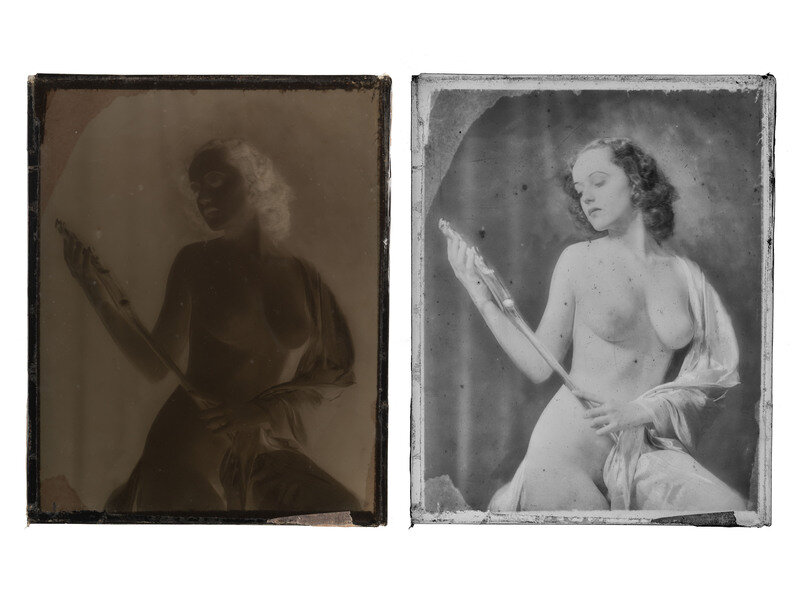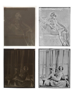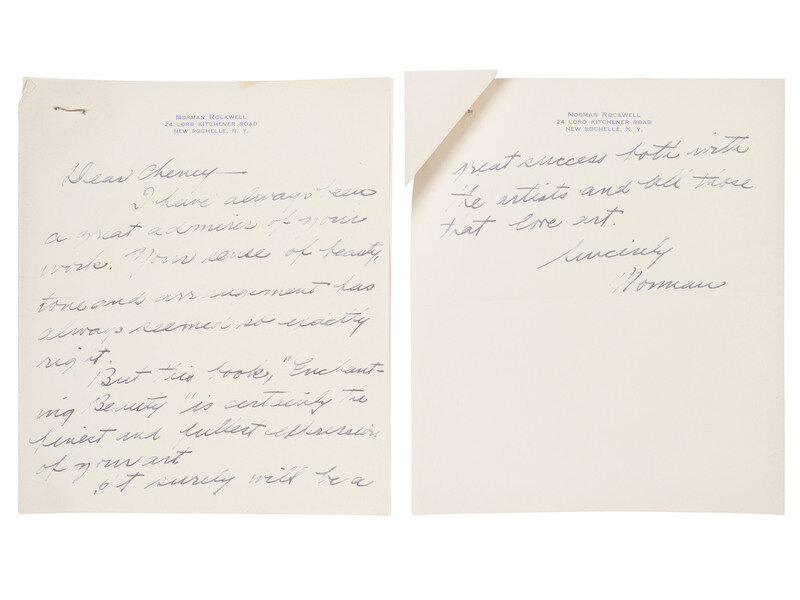 Additional items of note include: A letter signed and inscribed by Norman Rockwell to Johnston, undated, on “Norman Rockwell, New Rochelle, NY” letterhead. Rockwell writes to “Cheney,” expressing his admiration for Johnston’s work, stating, “this book, “Enchanting Beauty,” is certainly the finest and fullest expression of your art. It surely will be a great success both with the artists and all those that love art.” -- 36 glass plate negatives, ranging in size from 10 x 8 in. (32), to 14 x 11 in. (4), the majority depicting subjects that were featured in Enchanting Beauty.