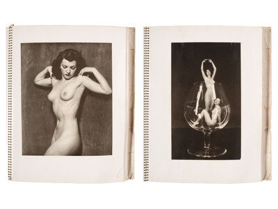 A spiral-bound mockup of Enchanting Beauty with drawing cover, layout for title page, title page illustration, and interior pages with nude studies. Additional letters from the printing company, typed forward, introduction, and commentary on photo techniques are also included (some pages, including drawing cover, layout for title page, introduction, foreward, etc., are detached). Enclosed within the final pages of the mockup are three letters from illustrators of the era, including an autograph letter signed by American illustrator McClelland Barclay, in which he writes to Johnston about Enchanting Beauty. He states in part, “To your many achievements, this book of pictures of beautiful interpretations of nudes of delight and charm, is a notable addition” (9 November 1937); a typed letter signed by Bradshaw Crandall, a famous glamour illustrator of the era. Crandall thanks Johnston for sharing an advance copy of the book and praises him for his work, “…I think it is one of the most beautiful collection[s] of feminine figures I have ever seen’ (12 November 1937); and a typed letter signed by Arthur William Brown, a Canadian commercial artist. Brown, who signs the letter “Brownie,” provides various quotes of praise for Johnston’s book, noting “chose the one you like the best…” (undated).