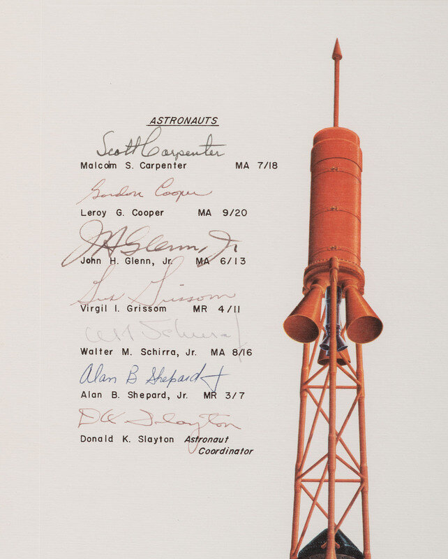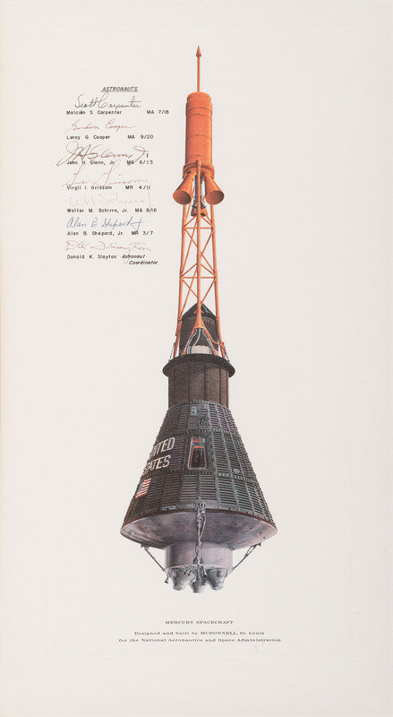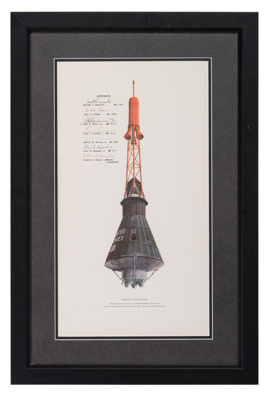 Mercury Spacecraft. Designed and built by McDonnell, St. Louis for the National Aeronautics and Space Administration. 21 x 11 1/4 in. (sight) print with the signatures of 7 Mercury astronauts, including: Malcolm S. Carpenter, Leroy G. Cooper, Jr. (likely autopen), John H. Glenn, Jr., Virgil I. Grissom (possibly autopen), Walter M. Schirra, Jr. (possibly autopen), Alan B. Shepard, Jr. (secretarial), and Donald K. Slayton (likely autopen). Matted and framed, 28 1/2 x 19 in. overall.