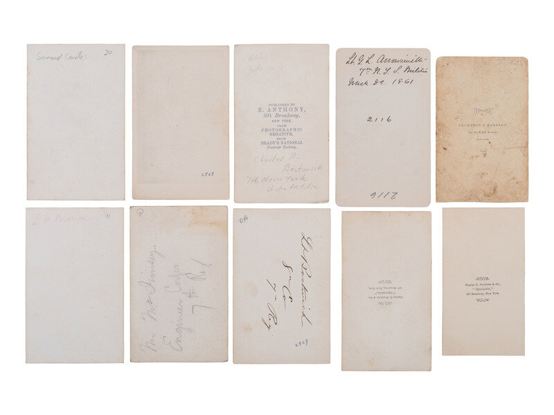 Many of the CDVs are uncredited with the exception of 11 images taken by Brady/Anthony, New York (1), J.H. Walzl, Baltimore, MD (1), Bogardus, New York (2), J.H. Young, Baltimore, MD (1), Charles D. Fredricks & Co., New York (2), Thompson & Hardley, New York (1), King, Portland (1), Maurice Stadtfeld, New York (1), McClees, Philadelphia, PA (1).
