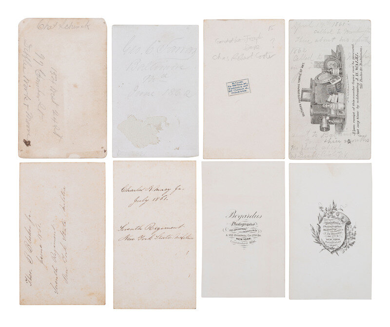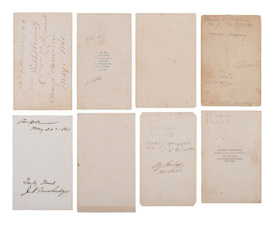 Charles Robert Coster, later served with the 12th US Infantry and 134th New York Infantry. -- Lieutenant Charles Bostwick (2), one inscribed on verso. -- Joseph A. Trowbridge, signed and inscribed on verso from Camp Cameron. 20 May 1861. -- Lieutenant G.L. Arrowsmith, inscribed on verso from Washington, DC, 1861. -- Private Daniel R. Franklin. -- Captain George Farrar, inscribed and possibly signed on verso from Baltimore, June 1862. -- Charles A. Shenck. -- Charles A. Macy, Jr., inscribed and possibly signed on verso, July 1861. -- Theodore B. Bleecker, inscribed and possibly signed on verso, July 1861. -- Corporal Robert McJimsey. -- Private Samuel Curtis. -- William H. Schermerhorn. -- Possibly S.B. Brownell, inscribed and signed on verso from Camp Cameron, May 1861. -- And 12 others.