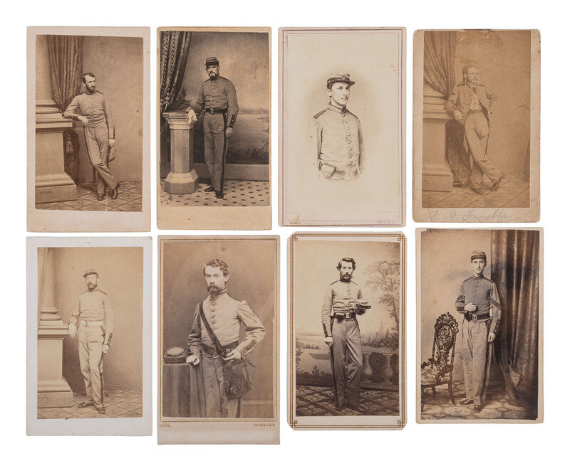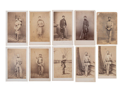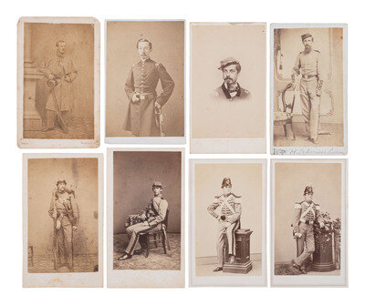 26 CDVs showing members of the 7th New York State Militia, Cos. G, H, K, and Engineers, some subjects identified, ca 1861-1863. Most of the CDVs are on period cardstock mounts with photographer's imprint or period inscription or signature on verso, but some are affixed to what appear to be later cardstock mounts.