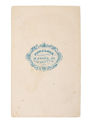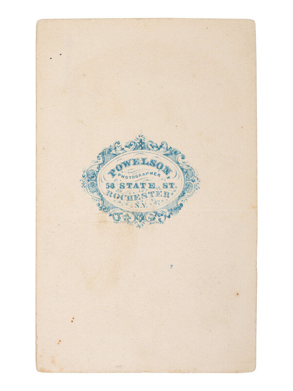 CDV on cardstock mount (horizontal creasing appearing to be from previous fold at center, soiling throughout, wear to edges and corners of print and mount). Verso bears Powelson's 58 State Street imprint.
