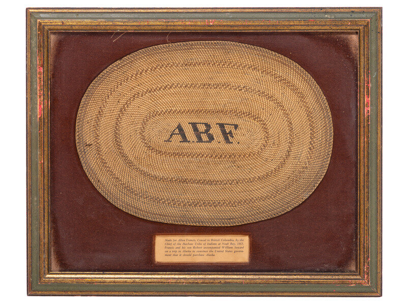 Printed paper labels beneath each mat describe the artifacts as being made specially for the recipient, "by the Chief of the Machaw Tribe of Indians at Neah Bay, 1865." Text further explains that Hon. Allen B. Francis and his son, Robert, accompanied William H. Seward on a trip to Alaska to determine the advisability of the United States purchase of Alaska. Robert Francis charted the waters of Alaska for the United States Government.