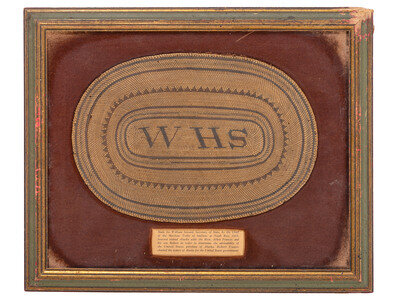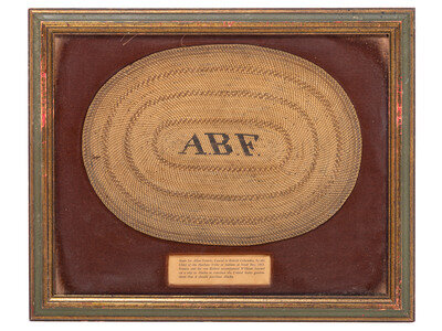 2 woven mats, one measuring 11 1/2 x 8 in., with initials "WHS" at center for William H. Seward; the other measuring 11 3/4 x 8 1/2 in., with initials "ABF" at center for Allen B. Francis. Both mounted on velvet displays and framed to approx. 16 1/2 x 13 1/4 in.