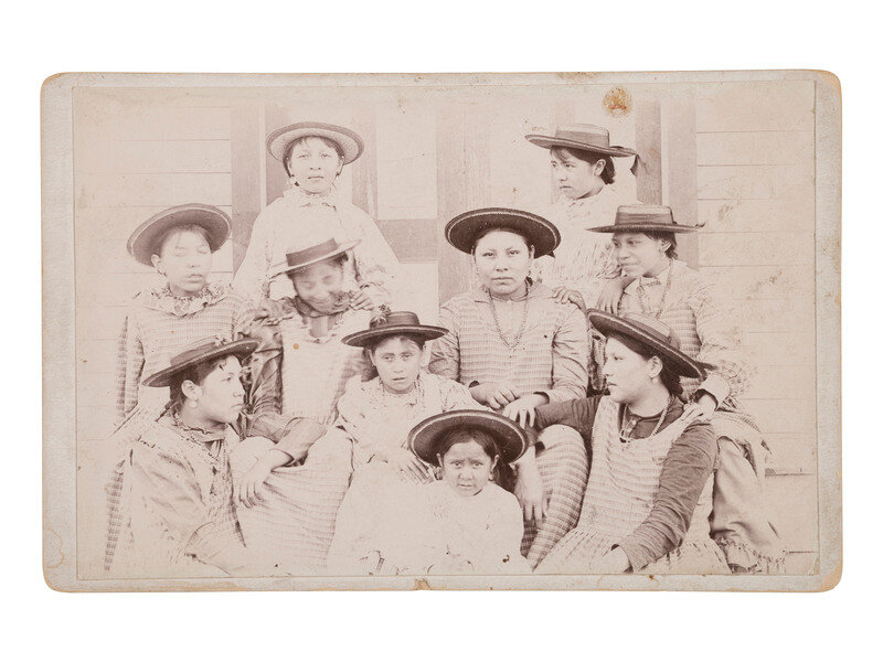 [NATIVE AMERICANS]. Cabinet card of female Indian School students with ledger drawing on verso.
