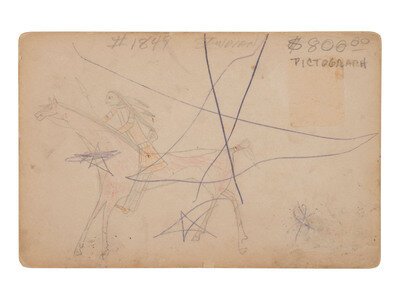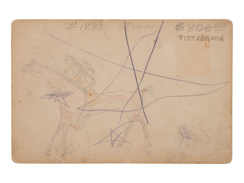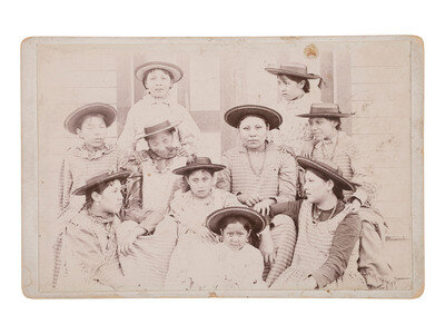 Cabinet photograph on cardstock mount featuring an outdoor view of a group of ten young female Indian School students wearing matching hats and coordinating jumpers, likely uniforms. They are gathered together on the front porch of an unidentified location. Photographer unknown. Verso with lightly hand colored, penciled ledger drawing of a Native American warrior mounted on horseback, possibly produced by one of the students featured in the photograph.