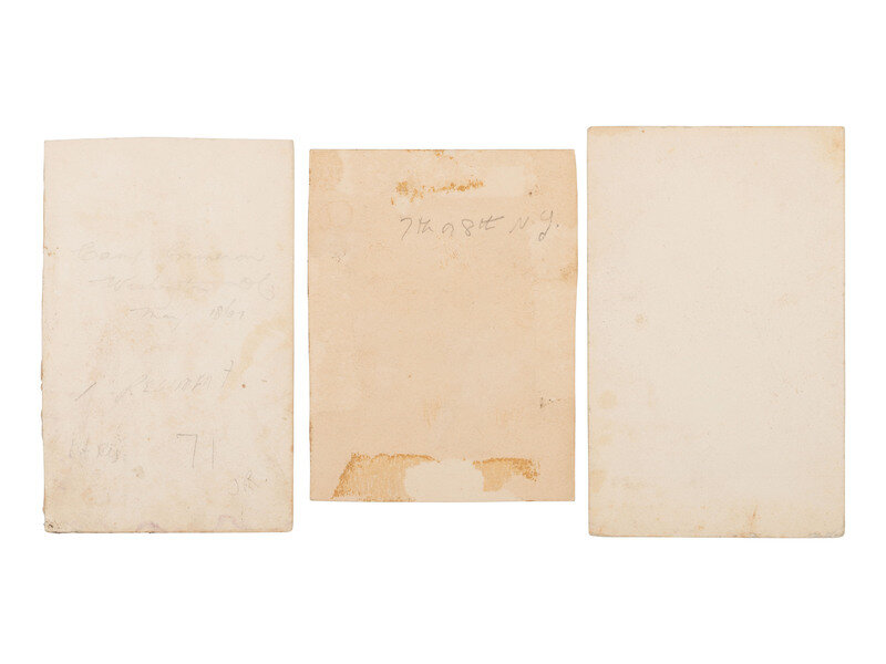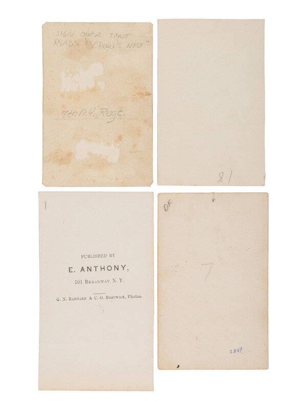 8 photographs, approx. 3 3/8 x 2 3/8 in. or smaller, on cardstock mounts. Two of the photographs include studio imprints, the first with the verso imprint of E. Anthony, publisher / Barnard & Bostwick, photographers, and the second with Brady's Washington, DC imprint on recto. The remaining images are uncredited but may have been taken by Barnard & Bostwick or Mathew Brady's studio.