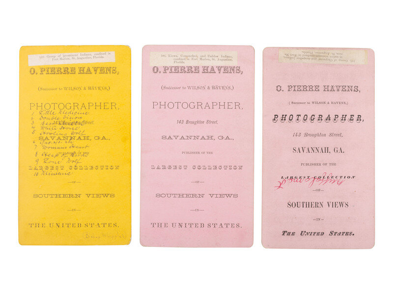 3 scabinet-sized stereoviews on orange and yellow mounts, each with O. Pierre Havens' imprint on verso and applied paper label with printed image number and caption. Views include: 106. Kiowa, Comanchee [sic], and Caddoe Indians, confined in Fort Marion, St. Augustine, Florida. -- 110. Group of prominent Indians, confined in Fort Marion, St. Augustine, Florida. This view also bears inked identifications of the subjects on verso, which correspond to inked numbers on mount recto, including Little Medicine, Double Vision, Bear Child, White Horse, Howling Wolf, Quo-yo-uh, Woman's Heart, Heap of Birds, Lone Wolf, and Minianic[?] -- And 121. Group of Cheyenne and Arapahoe Indians, in native costume, confined in Fort Marion, St. Augustine, Florida. This view also bears inked inscription to verso reading "Buffalo meat," perhaps the identity of one of the subjects featured in the image. -- Together, 3 views.