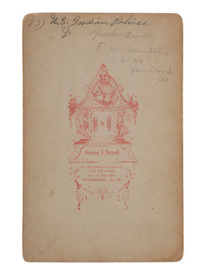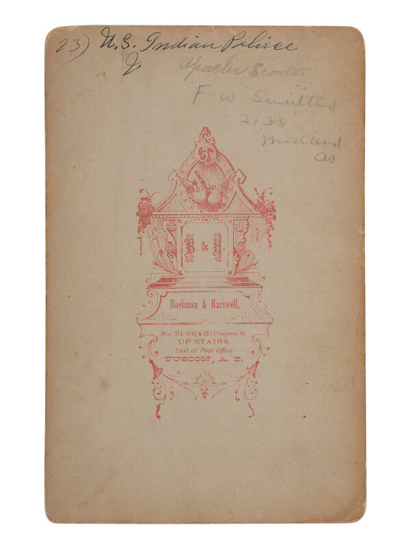 Cabinet card cropped portrait of a group of Pima policemen, with Buehman & Hartwell's pictorial imprint on verso along with ink inscription reading "U. S. Indian Police."