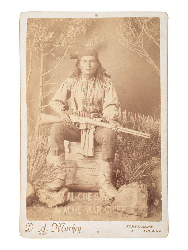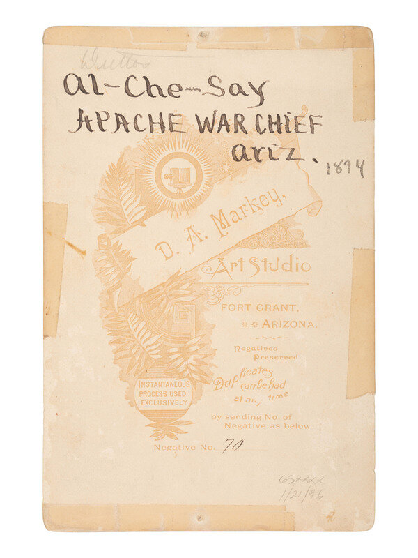 Cabinet photograph on cardstock mount with studio imprint on recto and verso of D.A. Markey, Fort Grant, Arizona. The subject, who is shown seated with a rifle in hand, is identified in the negative and on verso as, "Al-Che-Say, Apache War Chief." Verso includes handwritten date of 1894 and negative number, "70."