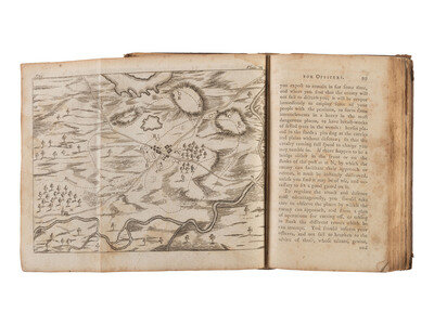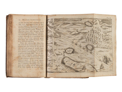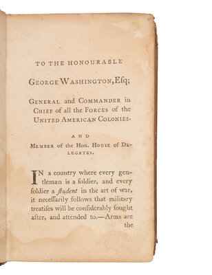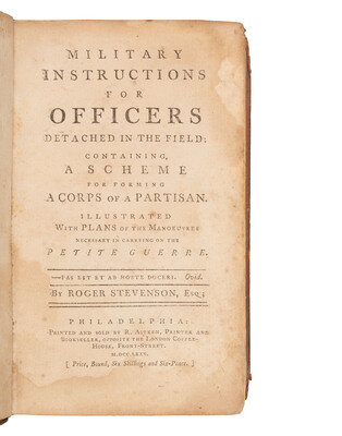 Military Instructions for Officers Detached in the Field was printed during the first months of the Revolutionary War and precedes by four years Baron von Steuben's Regulations for the Order and Discipline of the Troops of the United States. The engravings included within the text illustrate military strategies which also include guerilla tactics, a type of warfare ultimately essential in helping the United States to win the war. Stevenson's work is further notable for being the first book printed in the United States to be dedicated to General George Washington, who had been commissioned Commander in Chief of the Continental Army only a few months earlier. ESTC W20757; Evans 14475; Hildeburn 3290; Howes, S91, "aa"; Reese, Revolutionary Hundred, 35; Sabin 91607.