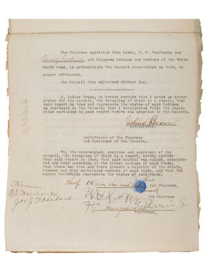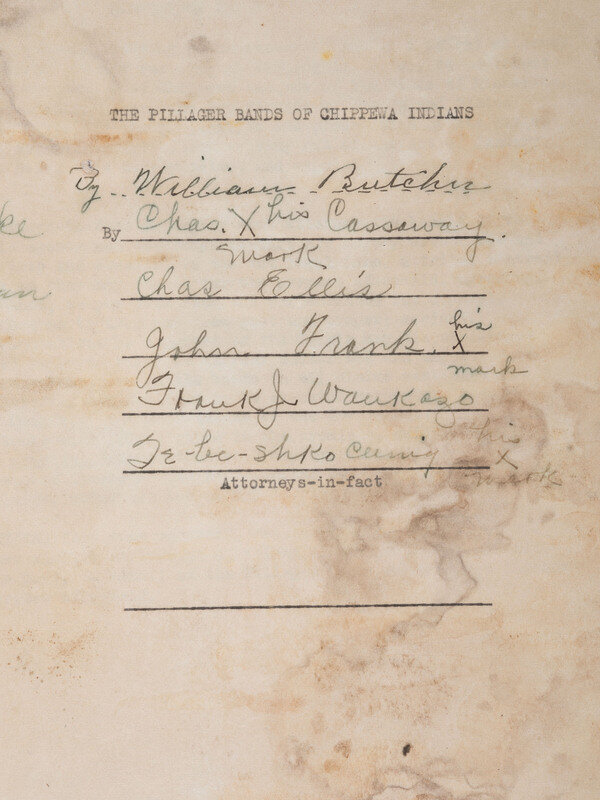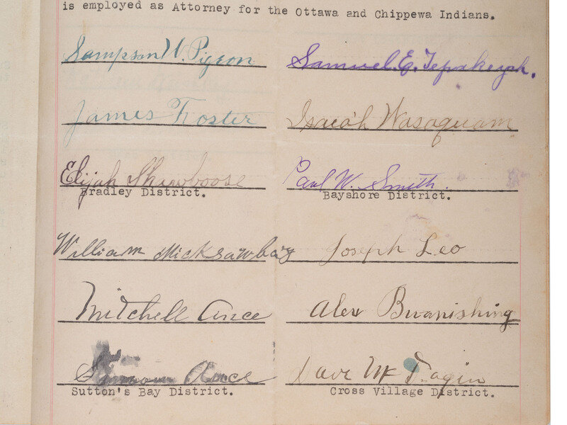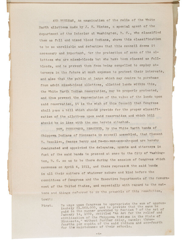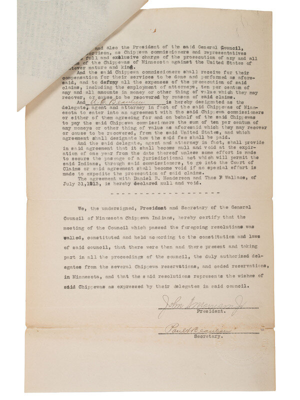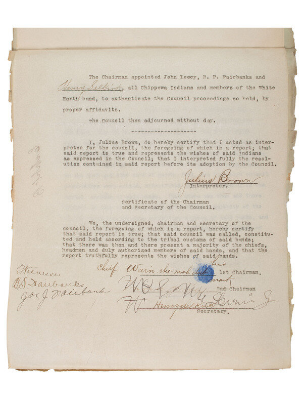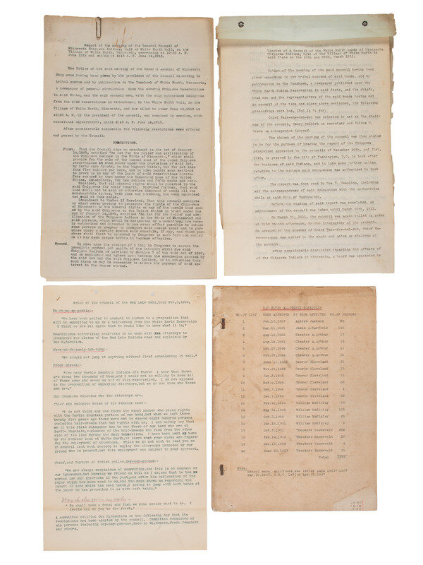 "Notes of the council of the Red Lake band, held Nov. 3.1900." -- Bad River Allotment Schedules. 1907 [or later]. -- "Minutes of a Council of the White Earth bands of Minnesota Chippewa Indians, held at the Village of White Earth in said State on the 15th and 25th, March 1911." -- Correspondence and documentation related to expenses incurred for travel, translators, and legal matters, and submitted by tribal members while visiting Washington as Chippewa delegates from the White Earth reservation, Minnesota. 1914. -- "Report of the meeting of the General Council of Minnesota Chippewa Indians, held at White Earth Hall, in the Village of White Earth, Minnesota, commencing at 10:30 A.M. June 12th and ending at 4:15 A.M. June 14, 1915." -- Contract for Daniel B. Henderson to provide legal representation for the Ottawa and Chippewa Tribe of Indians residing in the State of Michigan. Dated April 6, 1920. Includes a certificate signed by the Executive Committee of the Ottawa and Chippewa Indians of the State of Michigan. -- "Attorneyship Contract" between Daniel B. Henderson and the Pillager Bands of Chippewa Indians securing legal representation by Henderson, signed by tribal leaders. 1929.