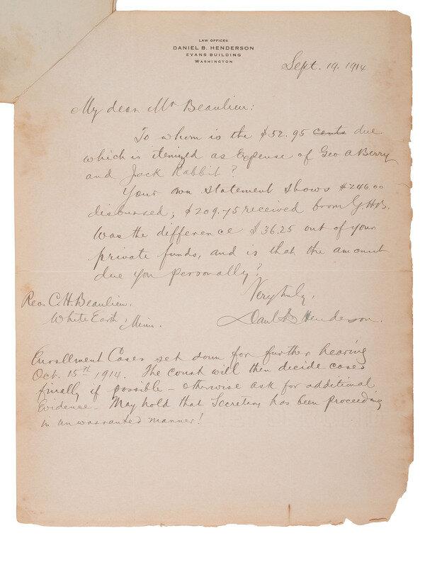 Daniel Brosius Henderson, Sr. (1862-1940) spent the bulk of his career litigating on behalf of America's Native peoples. His work centered in large part on the legal aftermath of the Dawes Act, allotments, and evaluation of treaties and Native American rights. He was born in Hancock, Maryland, attended the University of Virginia, and by the late 1800s had established a law practice in Kansas City, Missouri. After more than a decade in Missouri, Henderson and his growing family returned to Virginia in 1901. It was in Washington, DC, where the young lawyer would distinguish himself as a prominent attorney with a specialization in Indian claims litigation. Over the course of a decades long career, he represented the claims of multiple tribes in disputes against the US government.