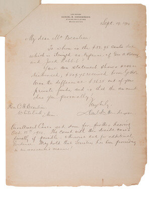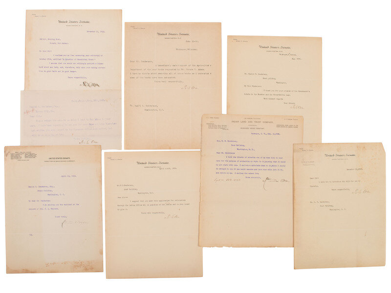 [With:] Correspondence between Henderson and various politicians and governmental officials, including multiple letters signed by Robert L. Owen, one of the first two senators from Oklahoma who as a lawyer in 1906 won a major court case on behalf of the Eastern Cherokees seeking compensation from the U.S. Government for eastern lands the Cherokees had lost at the time of the Indian removals. Other political correspondents include U.S. Senator John Sherman of Ohio, White House Executive Clerk Rudolph Forster, U.S. Representative Halver Steenerson of Minnesota, and U.S. Senator Moses E. Clapp of Minnesota.