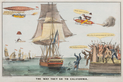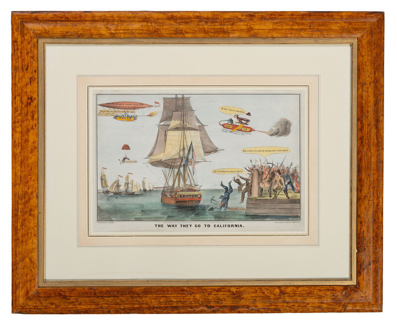 Currier produced numerous prints satirizing the mad rush for the gold fields of California. In this print and its counterpart, The Way They Came From California (see Lot 213), special emphasis is placed upon the apparently equivalent desperation of men eager to get to California and (once they've acquired some gold) to get back from California. All were originally issued as black and white depictions; this lithograph and others from the same series in this auction, have later applied coloring.