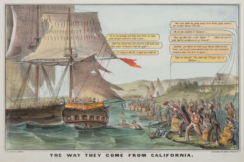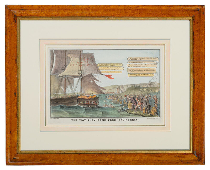 17 1/4 x 10 3/4 in. lithograph (image), framed to approx. 31 1/4 x 25 1/4 in. Title and copyright printed beneath image. A vibrantly colored depiction of two ships laden with passengers bound for the the east coast, leaving behind dozens more men eager to set sail from the shores of California. A determined few have even jumped into the water, swimming toward the ships. Sacks of gold line the shore and appear stacked in tents visible in the background. Text representing speech coming from passengers in the foremost ship reflects fears that the amount of gold aboard the ship will cause it to sink. Speech coming from miners ashore reveal fears that they will starve, with one miner offering one million dollars to be taken aboard the ship.