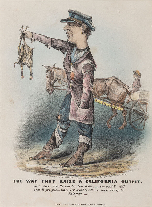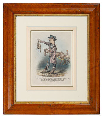 8 3/4 x 11 7/8 in. lithograph (sight), matted and framed to 22 x 25 1/4 in. Title and copyright printed beneath image, along with caption reading, "Here—saay—take the pair fur four shilln:—you wont? Well what-'ll you give—saay. I'm bound to sell um, 'cause I'm up Kaleforny.—" Featured is a man dressed in tattered clothing, holding up two scrawny chickens. A ragged woman sits in a wagon led by a bony horse in the background. Text beneath the horse reads, "Overland route too Kalofoney."