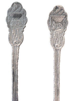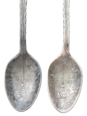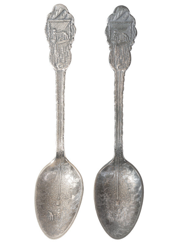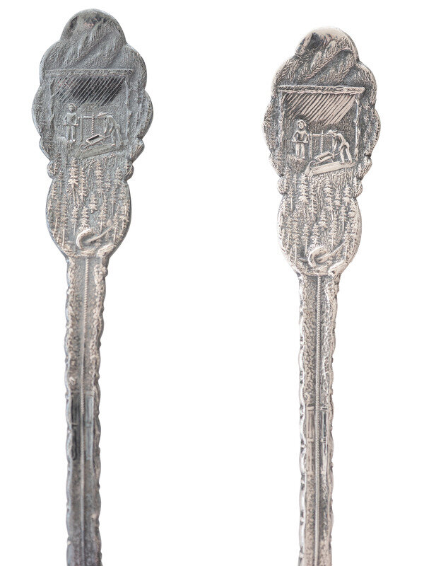 [WESTERN AMERICANA]. A group of 2 Henry Bohm silver banquet spoons commissioned by railroad magnate Otto Mears and featuring detailed mining scenes, ca 1890s.