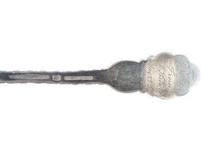 Otto Mears (1840–1931) was a Colorado railroad builder and entrepreneur who played a major role in the early development of southwestern Colorado. Mears was known as the "Pathfinder of the San Juans" because of his road and railroad building projects through Colorado's San Juan Mountains in the late 19th century. He built hundreds of miles of toll roads in the rough terrain of the young state of Colorado, notably the Million Dollar Highway over Red Mountain Pass, connecting Silverton to Ouray, Colorado. Mears is also famous for the silver railroad passes that he made and issued for the various railroad lines he owned in the Rocky Mountains. See "The Remarkable Railroad Passes of Otto Mears" (William Strong, Silverton, Colorado, 1988, also with pg. 29 featuring an image of Mears spoons). There are varying historical accounts of where and when the mining scene spoon was distributed, including one account which indicates that the spoons may have been distributed to Silverton Railroad directors and major investors at a banquet in Silverton, Colorado, in late 1890. It is likely that the Otto Mears sterling silver spoons were not sold to the public.