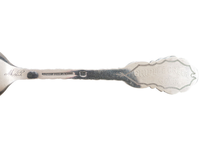 2 silver banquet spoons hallmarked by Henry Bohm of Denver on the reverse, each approx. 6 in. long, fronts with ornate mining scene extended from the bowl of the spoon up and into the handle. Miners depicted at the top, with a mining shaft running down the spoon handle dropping to the bucket at the mine's bottom where two other miners are working, loading the bucket to bring to the surface. The reverse of the spoons are each unique: one spoon at the top of the handle features an engraved text "Cripple Creek Colo.," while the reverse of the other spoon at the top of the handle features engraved text "C.G. / From / H. Knox / May 29, '99." Extremely rare.