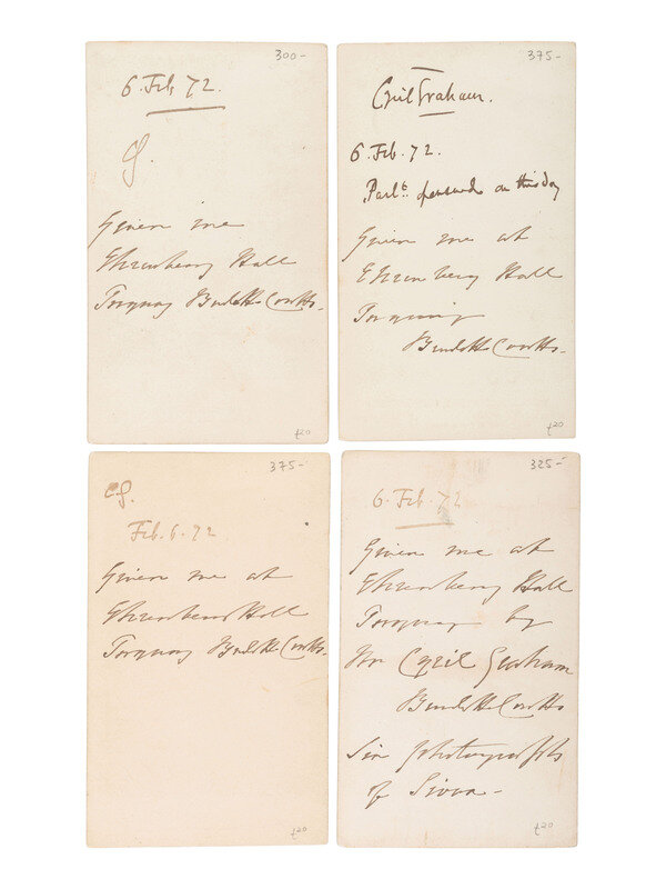 Each carte with collector's ink inscription on verso: "6 Feb. 72. Given me at Ehrenberg Hall, Torquay. [Signed] Burdett-Coutts."