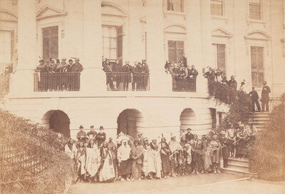 This photograph captures members of the various delegation members standing before the White House balcony with President Andrew Johnson in the center flanked by U.S. Indian Commissioner Lewis V. Bogy and Secretary of the Interior Orville H. Browning. Father Pierre Jean-De Smet, a Jesuit Missionary who worked tirelessly for native peoples stands at the railing at the base of a column to the right, surrounded by Native peoples. Many of the Native delegates were photographed multiple times by Gardner during this trip and with magnification are identifiable as to name and group.