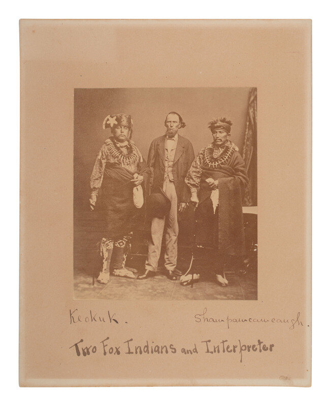 5 3/4 x 5 in. photograph on 10 x 8 in. mount with handwritten caption in lower margin, "Keokuk / Shawpawcawcaugh / Two Fox Indians and Interpreter." The subjects, who are erroneously identified on the mount as "Fox" Indians, are posed with an unidentified interpreter, probably taken in Topeka, Kansas, circa 1864.