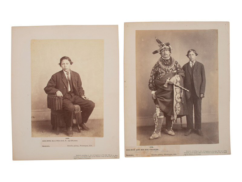 6 1/8 x 8 1/2 in. albumen photograph on 8 x 10 in. mount with printed paper labels affixed to lower margin, the first identifying the subjects as "Keo-Kuk and His Son Charles" of Kansas, and crediting the photograph to Shindler. Penciled on this label is also "head chief of the Sacs." The second label bears copyright information. Verso with partly printed exhibition label from the Second International Congress of Eugenics held at the Museum of Natural History in New York, 1921.