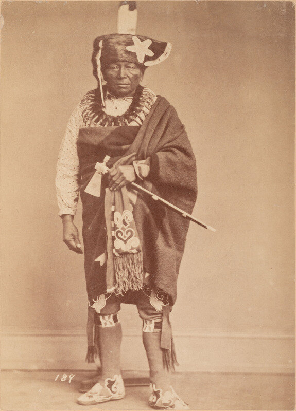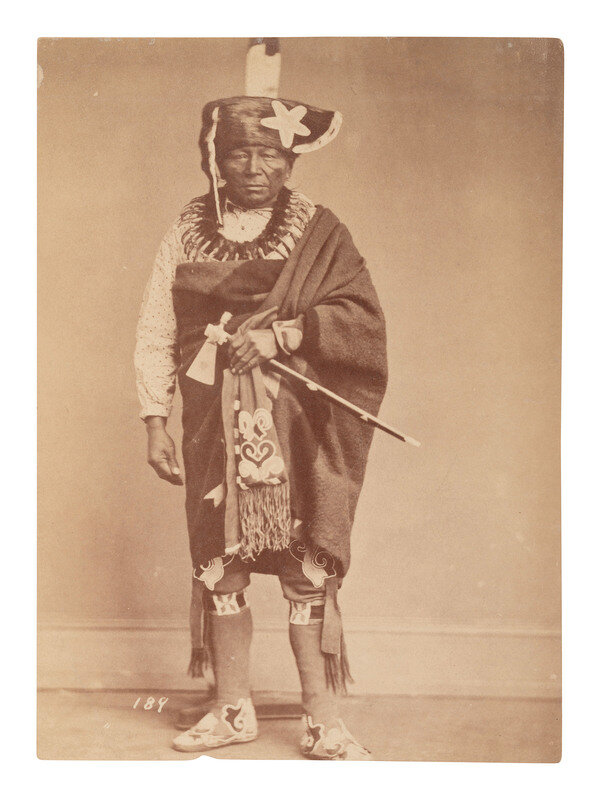 Taken in Washington, DC before 31 March 1868 during a delegation visit, this portrait of Chief Che-ko-skuk displays his impressive bear claw necklace and pipe tomahawk, which he holds with the same hand that clasps his beaded pipe bag. He also wears an interesting beaver hat with 5-pointed star motif on the front and a single feather standing vertically at the back. This may be the same hat worn Moses Keokuk, another member of the 1868 Sauk and Fox delegation, when he was photographed by Mathew Brady.