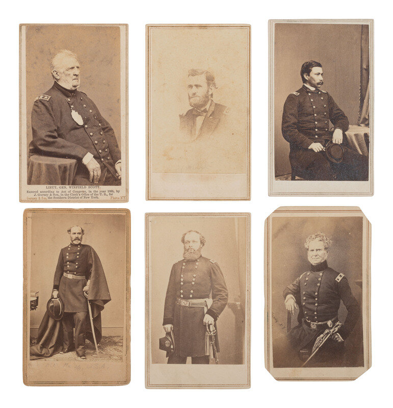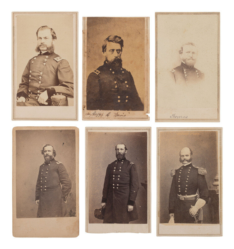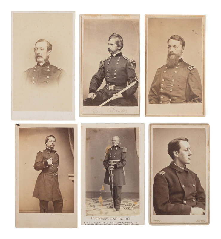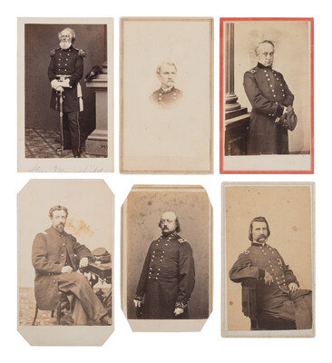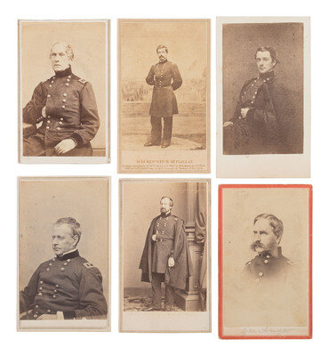 30 CDVs, including: Benjamin BUTLER. New York: E. & H. T. Anthony (Brady negative). -- Joseph K. MANSFIELD. New York: E. Anthony (Brady negative). -- John LOGAN. Washington, DC: John Goldin & Co. -- Christopher C. AUGUR. Washington, DC: Whitehurst. -- Montgomery C. MEIGS. New York: E. & H. T. Anthony (Brady negative). -- Francis C. BARLOW. New York: Brady. -- Joseph HOOKER. Uncredited. -- George D. BAYARD. New York: Charles D. Fredricks & Co. -- Winfield SCOTT. New York: Gurney & Son, 1865. -- Ambrose BURNSIDE. New York: E. Anthony (Brady negative). -- George B. MCCLELLAN. New York: E. & H. T. Anthony (Brady recto copyright statement, 1862). -- Alpheus WILLIAMS. New York: E. & H. T. Anthony (Brady negative). -- Jefferson C. DAVIS. Uncredited. -- Winfield Scott HANCOCK. New York: E. & H. T. Anthony (Brady negative). -- George STONEMAN. New York: E. & H. T. Anthony (Brady negative). -- William Jenkins WORTH. New York: Brady (thin mount). -- Quincy Adams GILMORE. New York: E. & H. T. Anthony (Brady negative). -- Ulysses S. GRANT. Uncredited. -- John A. DIX. New York: E. Anthony (Brady negative and recto copyright statement, 1861). -- William ROSECRANS. New York: E. & H. T. Anthony (Brady negative). -- William Woods AVERELL. New York: E. & H. T. Anthony. -- And 9 others including Generals Banks, Torbert, Sprague, Halleck, and more. -- Together, 30 CDVs.