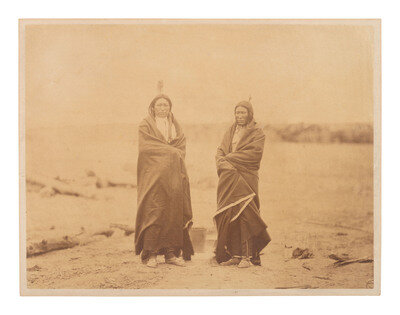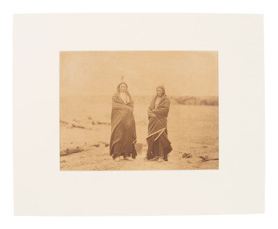 12 1/2 x 9 1/2 in. albumen photograph on 17 1/2 x 13 5/8 in. cardstock mount lacking Gardner's imprint but known to have been taken by him at Fort Laramie. Penciled identifications appear on mount recto, reading, "Brule Sioux / Spotted Tail, Fast Bear." The two braves stand together wearing blankets and single feathers atop their heads.