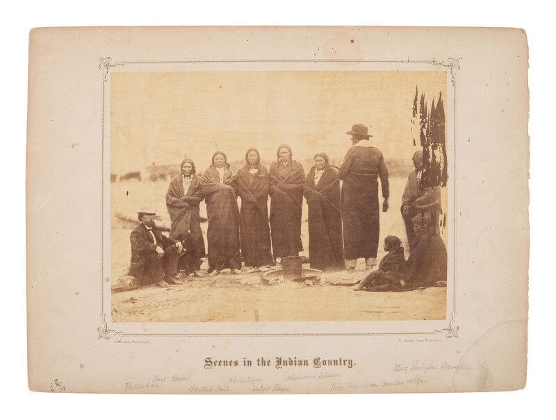 12 3/4 x 9 1/2 in. albumen photograph on original 19 1/4 x 14 1/8 mount with Gardner's imprint and "Scenes in the Indian Country" printed on mount recto. Penciled identifications of subjects to lower margin. Featured centrally is a group of Sioux subjects standing in a row and wearing blankets (one with his back to the camera), with additional seated subjects to either side. Subjects identified in pencil as: Palladan, Fast Bear, Spotted Tail, White Eyes, Swift Bear, Whirlwind Soldier, Big Man on Mule's wife, and Big Partgan's Daughter.