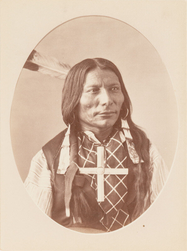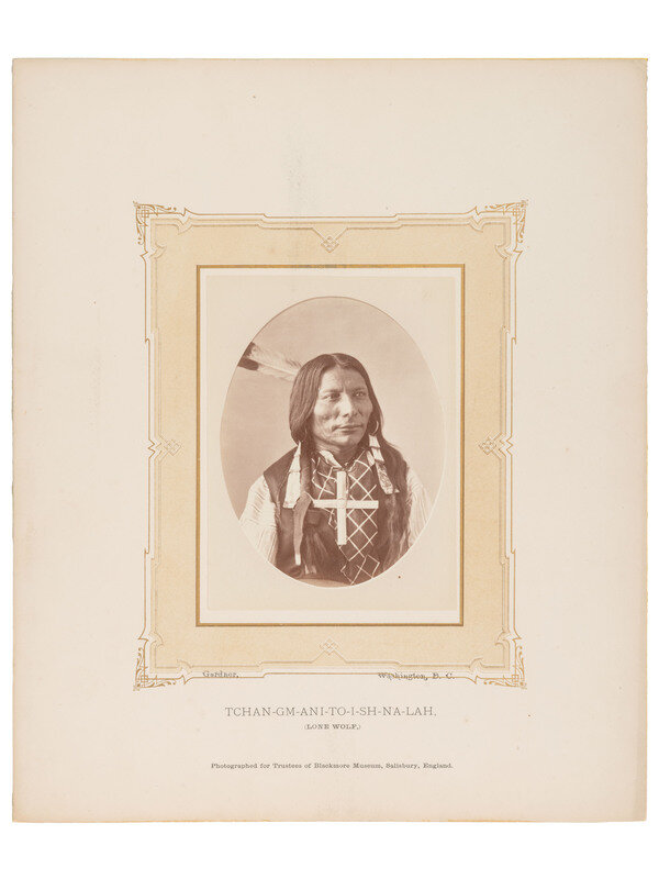 5 1/4 x 4 in. albumen photograph, tipped on ornately scrolled Blackmore Museum mount, 12 x 10 in., ca 1870. Handsome portrait of Lone Wolf wearing a large silver cross, two hair feathers, and dentalium earrings. Lower margin of mount with credit to A. Gardner, Washington, DC, and imprint, "Photographed by Trustees of Blackmore Museum, Salisbury, England."